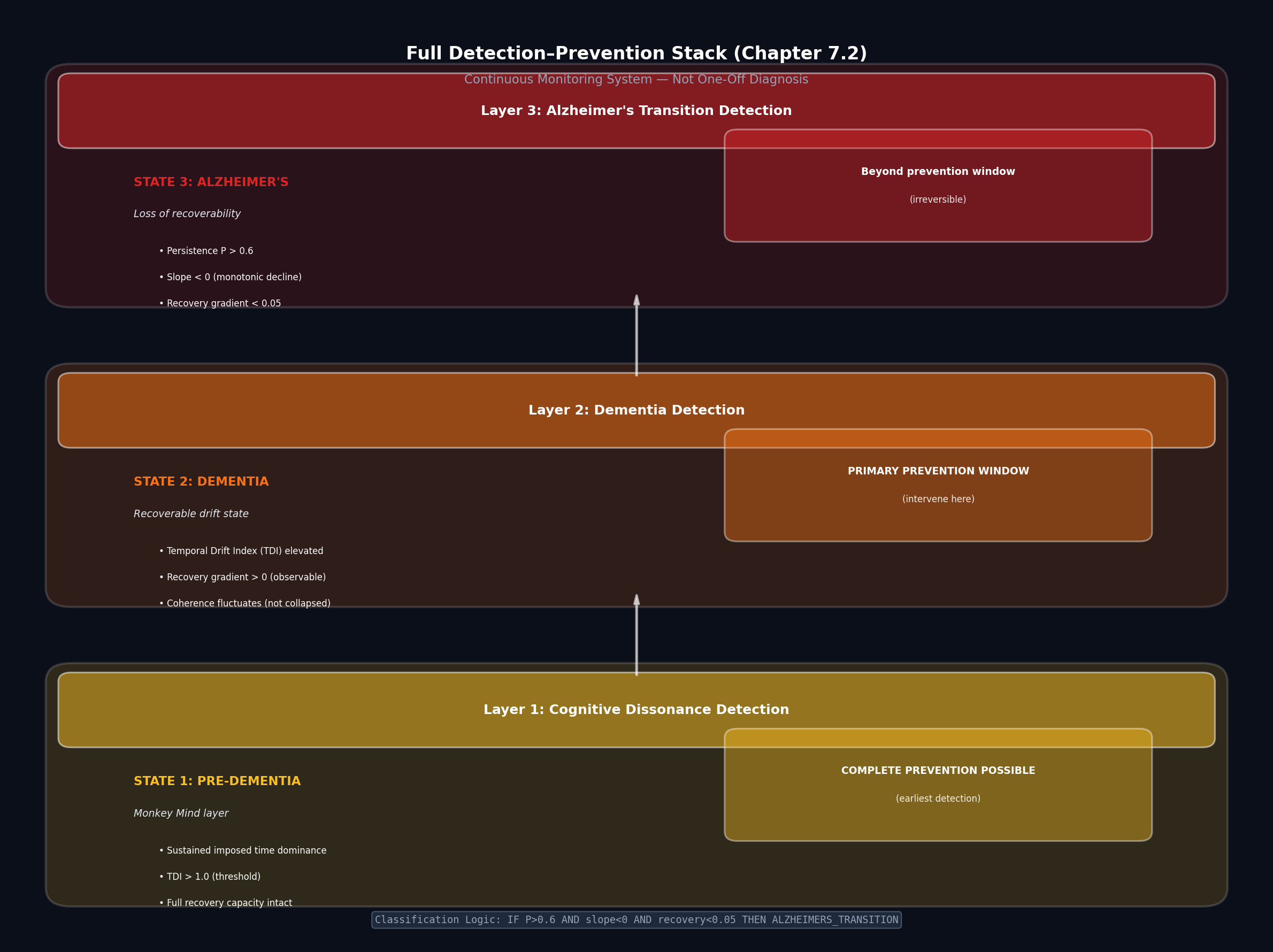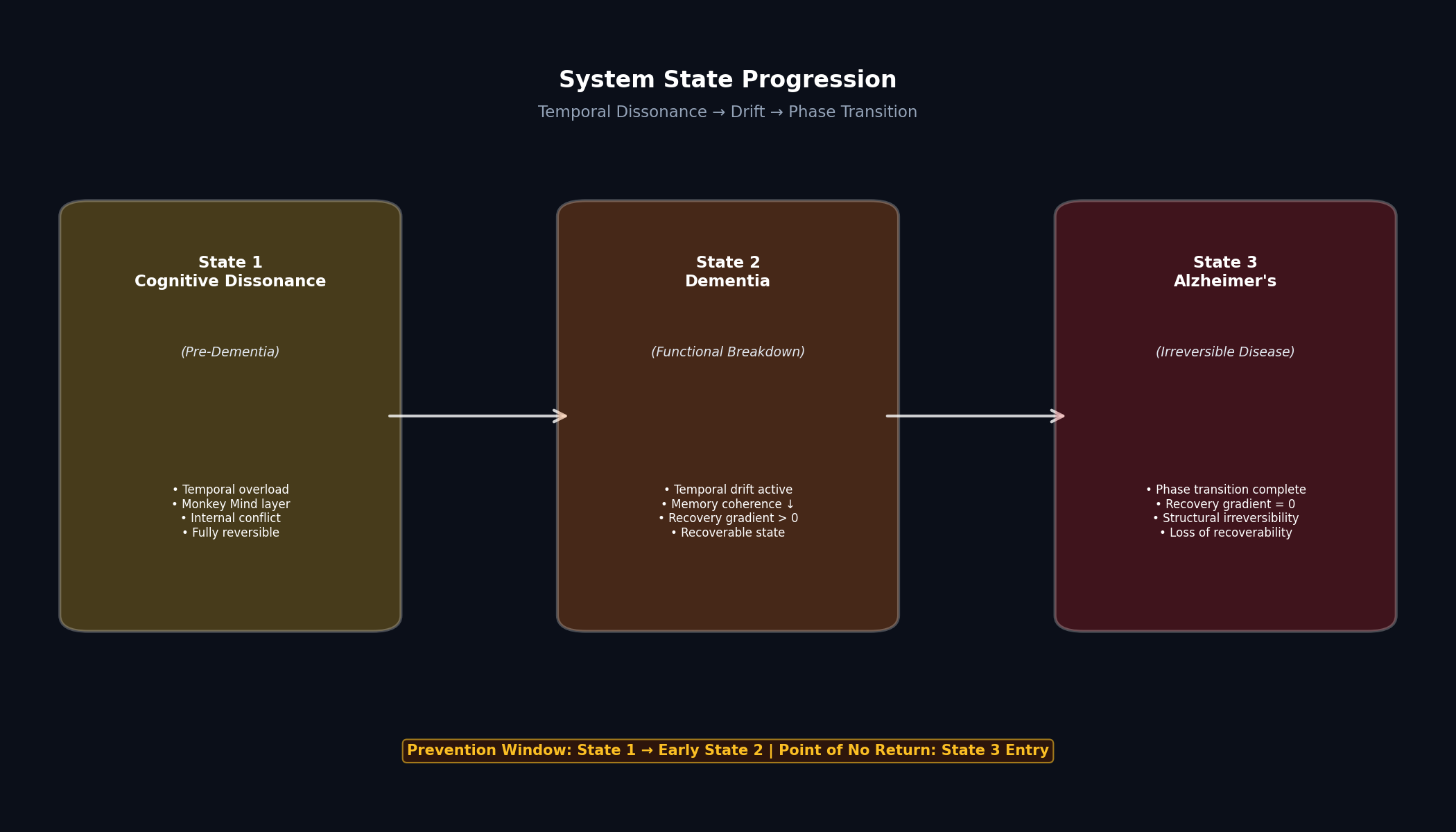 Cognitive Dissonance (Monkey Mind) ↓ Persistent Temporal Dissonance ↓ Dementia (Recoverable System) ↓ ← prevention window Loss of Recovery Gradient ↓ Alzheimer's (Irreversible Disease)
