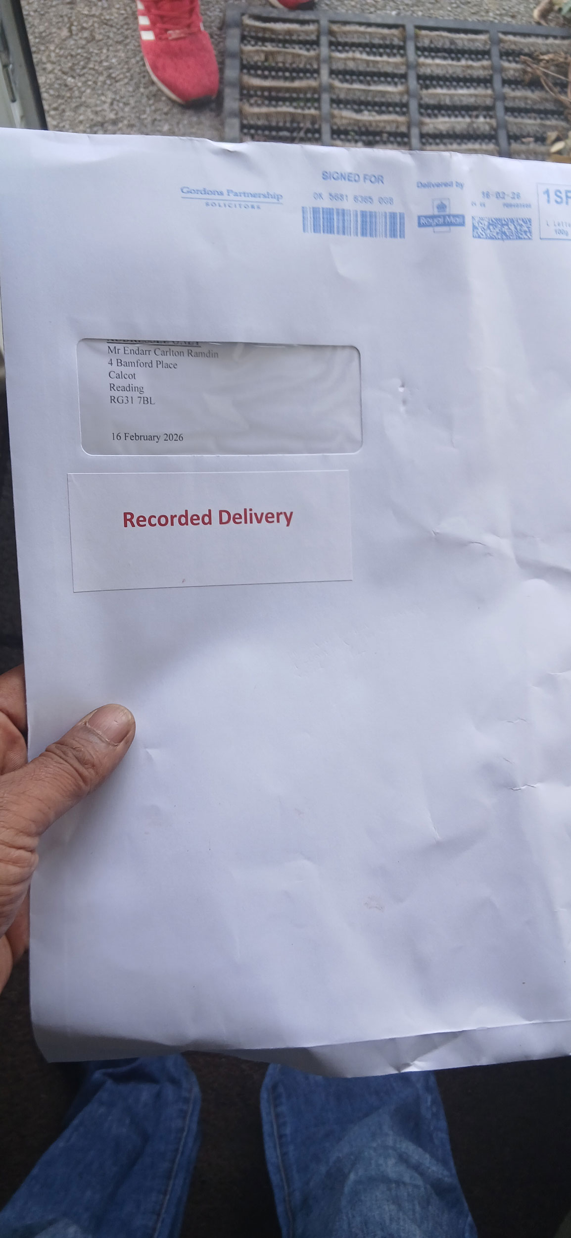 | EX01 | 17 February 2026 | 10:06 | Photograph of recorded delivery envelope from Gordons Partnership Solicitors LLP addressed to claimant residence. Letter dated 16 February 2026. Delivery refused. | First direct solicitor contact prior to claim submission |