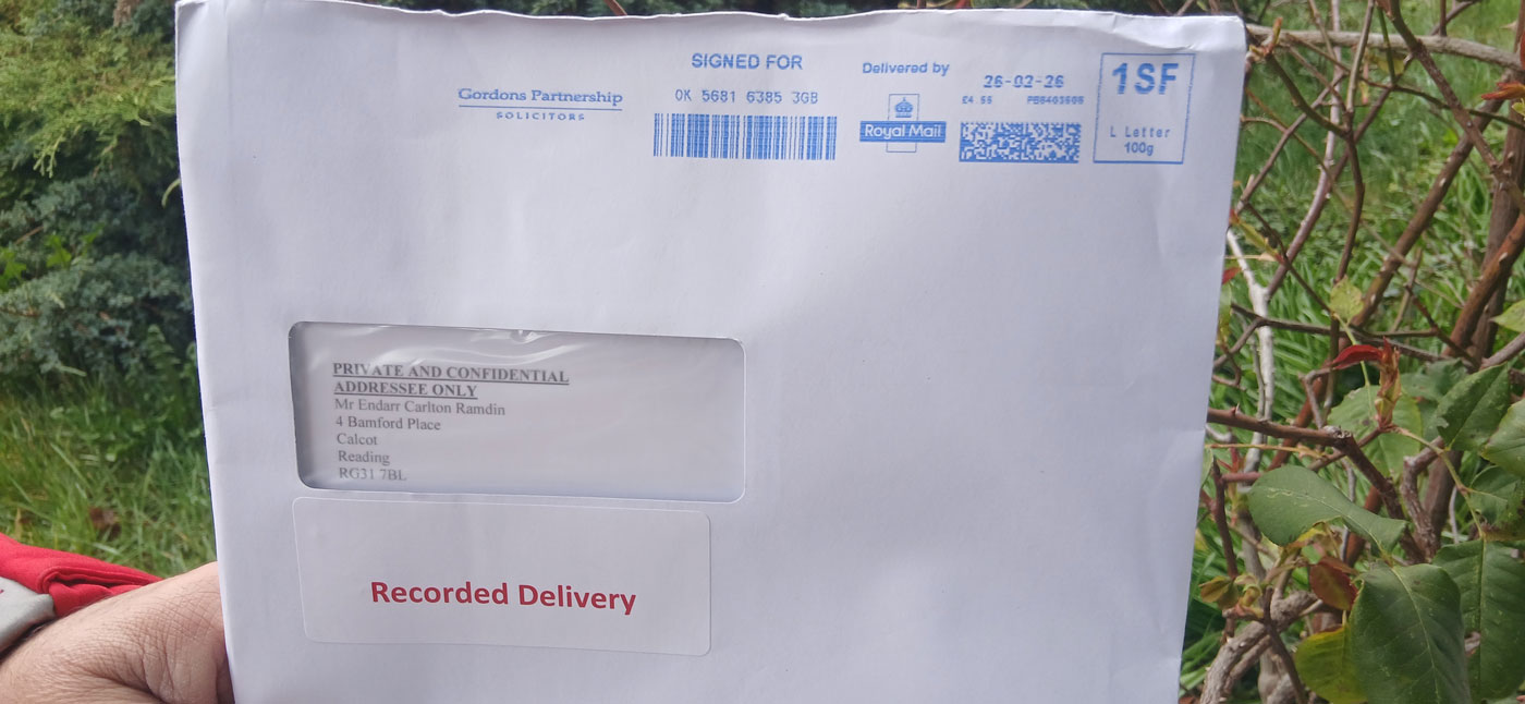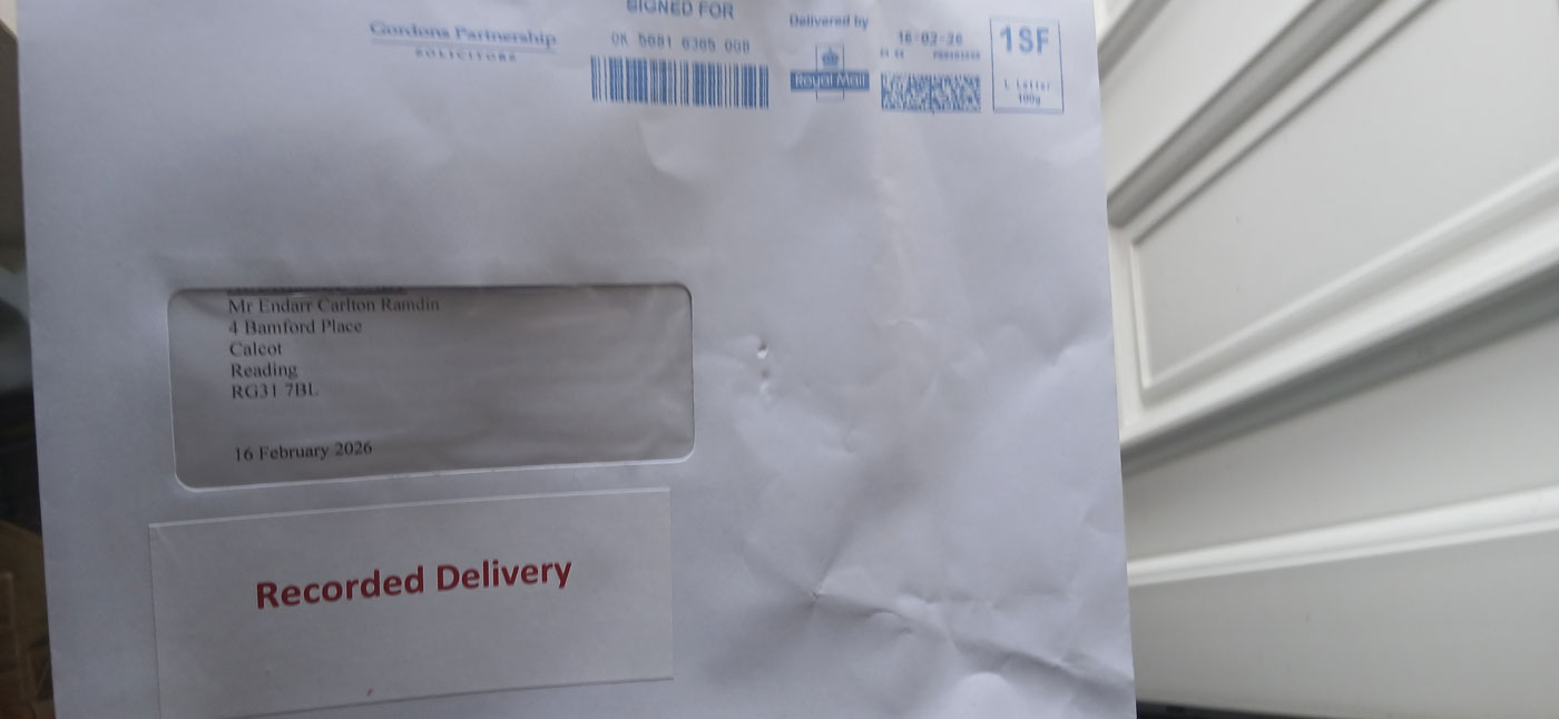 | EX01 | 17 Feb 2026 | 10:06 | First Gordons recorded delivery refused | Recorded delivery envelope from Gordons Partnership Solicitors addressed to claimant residence. Letter dated 16 February 2026. Delivery refused pending court route. |