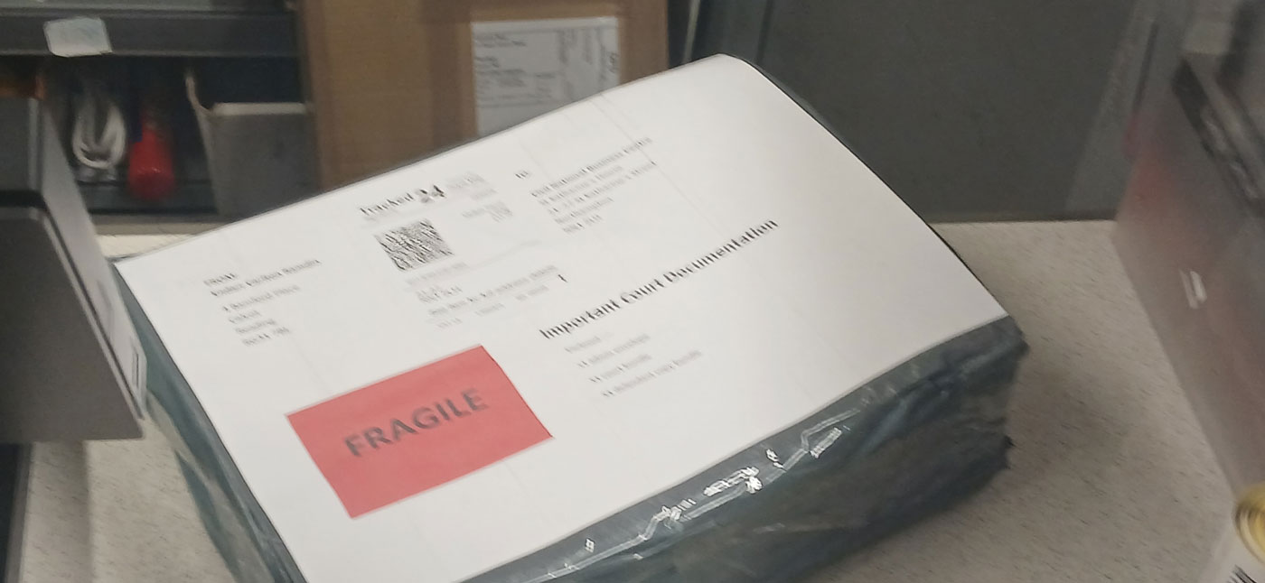 EX03 23 February 2026 09:37 Photograph of sealed claim bundle labelled “Important Court Documentation” at Post Office counter prior to dispatch to Civil National Business Centre Evidence of claim bundle preparation and dispatch