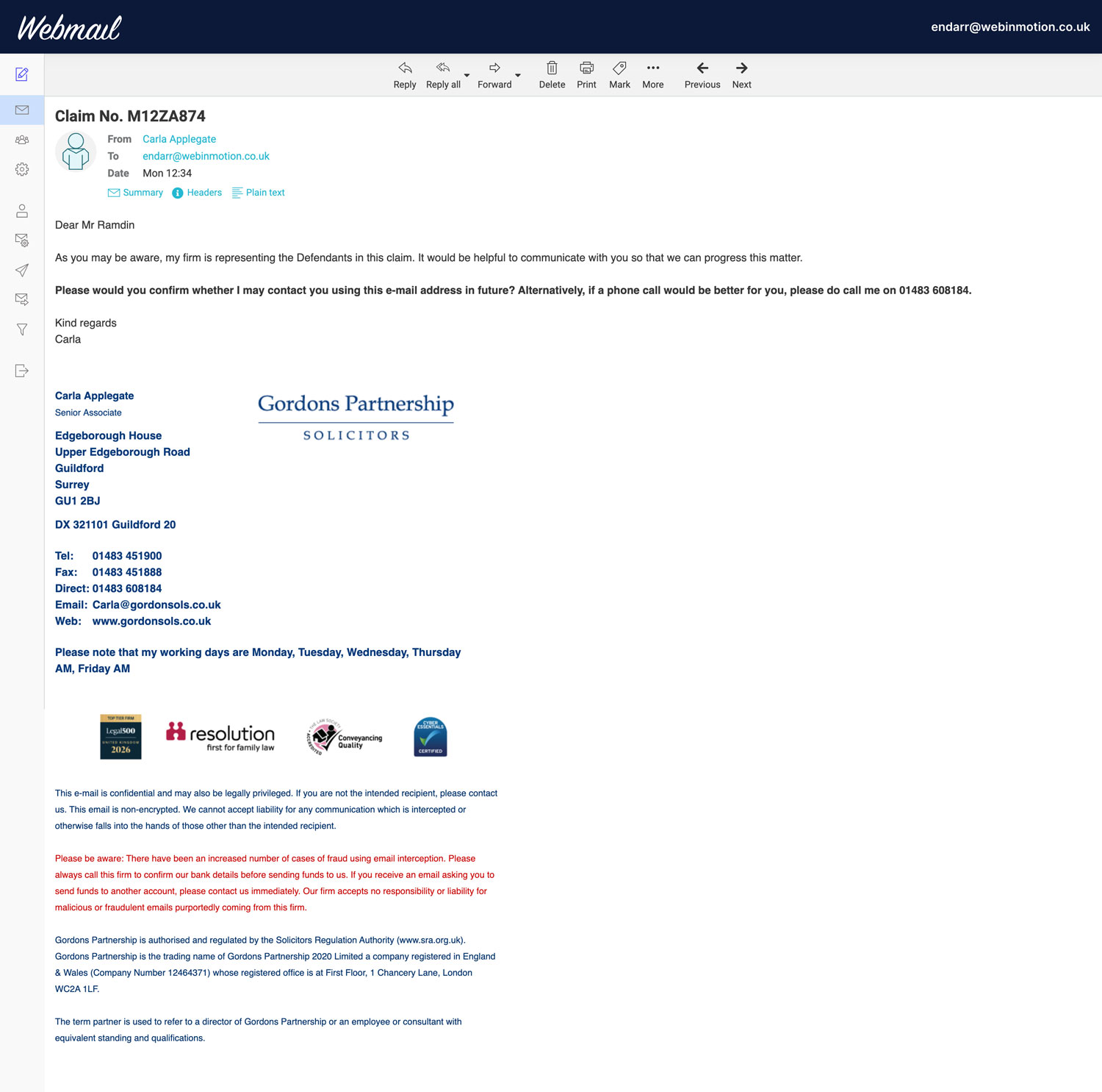 | EX08 | 31 March 2026 | 12:34 | Email from Carla Applegate, Gordons Partnership Solicitors, confirming representation and requesting communication regarding claim M12ZA874 | Continued extra-procedural contact during pending court processing |