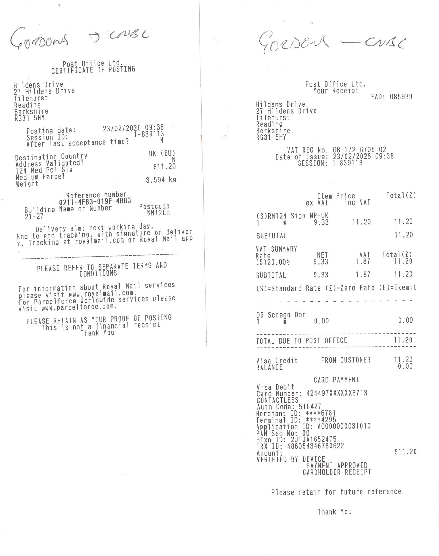 | EX04 | 23 Feb 2026 | 09:38 | Post Office receipt | Post Office receipt confirming dispatch of 3.594kg bundle to CNBC |