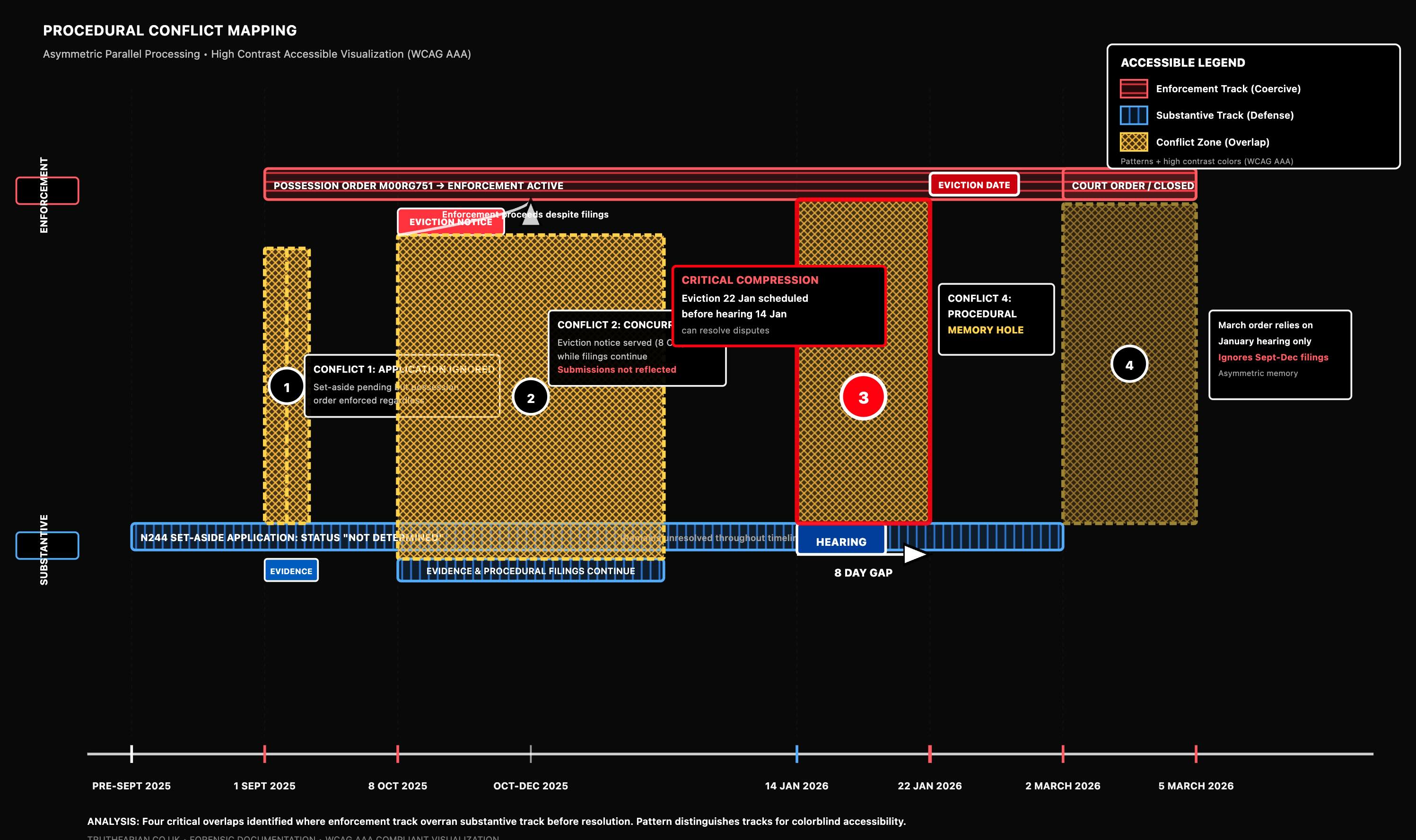 The active structural configuration — procedural breakdown ($P$), court administrative capture ($C$), landlord / safety failure ($L$), defence / counterparty interference ($D$), tribunal / welfare disruption ($T$), vulnerability amplifier ($V$), rights / regulatory misstatement ($R$), and institutional interlock ($I$) — reflects a **closed procedural loop** in which filings are made, not recorded, and decisions proceed on an incomplete evidential basis.